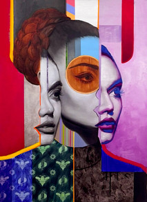 immortalizing any specific CEO or College President. He’s using the genre to ask questions about all of us right here, right now as we navigate our way through an Artificial Intelligence that comes pre-packaged out of a machine, infinitely reproduced and, unlike real people, immortal. His gorgeous women don’t meet our gaze. They look away as though there’s something they don’t want us to see. And they’re branded by the logo-like patterns that mark us as consumers of something we don’t quite understand. Skin surfaces dissolve into pixels. Heads break into fractals, the same image from slightly different perspectives, one flowing out of the other, all possibilities existing at once. Colors that radiate. Color that shocks.